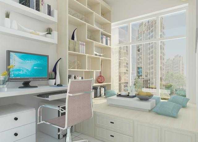 将平窗打造成环绕式飘窗,让书桌、书柜、储物柜连为一体,增强收纳空间,明亮的光线,开阔的视野,方便于主人在此办公、学习。