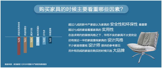 超过八成的新中产家庭认为家具的安全性和环保性最值得关注,尤其是有孩子的家庭。超过七成的家庭看重家具的实用性,在追求简约的装修风格之下,华而不实的家具显得不太受欢迎。还有接近一半的家庭重视家具的设计风格,不少家庭很重视设计师提供的参考意见。另外有四成的家庭在购买的时候只选大牌出品。