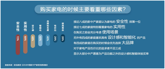 接近八成的新中产家庭认为家电的安全性是排在第一位的,接近七成的家庭特别看重家电的实用性,在购买之前会充分考虑使用的场景。另外有四成的家庭对于家电产品的设计感和智能化提出了自己的需求。有四成的家庭在购买的时候会优先选择大牌产品。对于家电产品性价比的追求者不足三成,显示大部分中产愿意为产品功能之外的设计感和智能体验买单。