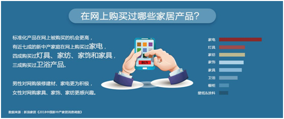 69%网购过家电;42%网购过灯具;42%网购过家纺;40%网购过家饰;37%网购过家具;30%网购过卫浴;16%网购过橱柜;15%网购过壁纸和涂料;